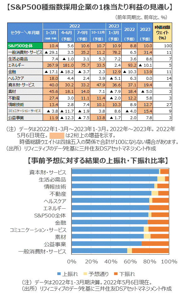 ■5月6日現在でS&P500種指数採用企業の87%の434社が22年1-3月期の決算を発表しました。1株当たり利益の前年比伸び率は+10.4%と4月1日時点予想である同+6.4%を上回り、2桁の伸びとなりました(リフィニティブ集計)。