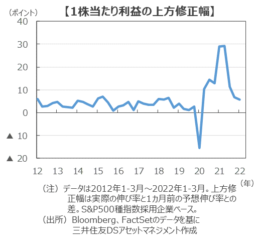 ■リフィニティブによれば、22年の増益率は前年比+8.8%、23年は同+10.0%と予想されています。米国企業を取り巻く環境は、サプライチェーンの混乱に伴う供給制約が解消されていない上に、対ロシア経済制裁に伴う資源価格の上昇、労働力不足による賃上げ圧力と、それを背景としたインフレ高止まり懸念など不透明な要因が山積しています。