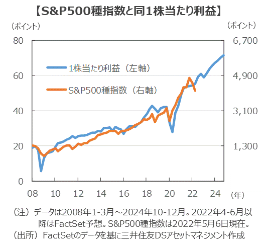 ■S&P500種指数とその1株当たり利益の推移をみると、S&P500種指数は概ね利益の成長に沿って上昇しています。08年以降は、低インフレ・低金利環境の下で十分な流動性と堅調な業績が米国株式市場を支えてきました。今後は、原材料価格や消費者物価の上昇・高止まり、政策金利の上昇など企業にとっては新しい環境下での事業展開となります。特に金融政策の変化は数年後に景気後退や成長率の低下へとつながる可能性もあるため、企業業績の先行きは慎重にみる必要があります。外部環境の変化に如何に対応するかが、今後の業績のカギを握ると思われます。