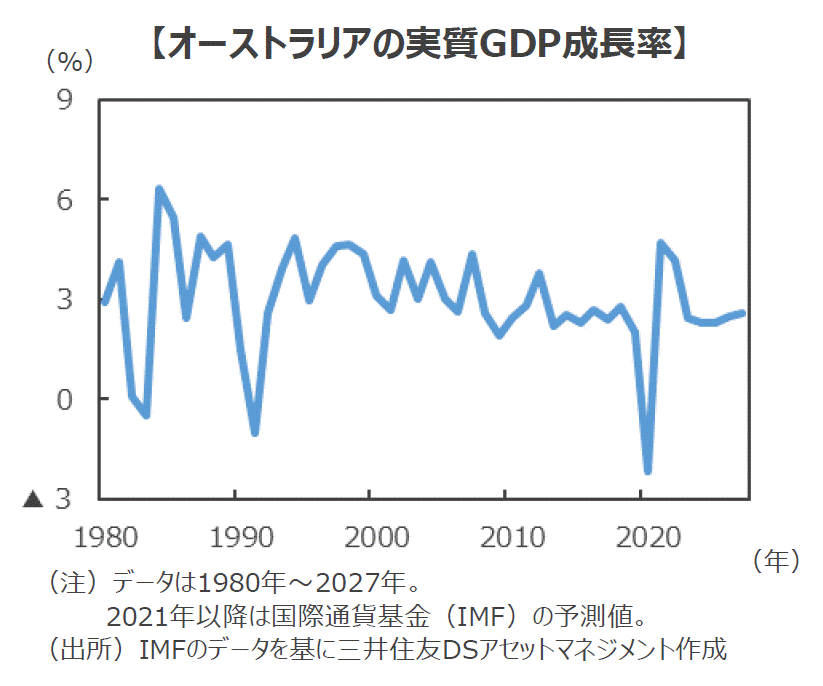 ■コロナ禍で厳格な都市封鎖が実施されたため、2020年のオーストラリア経済はマイナス成長となりましたが、それまで実に28年間にわたり連続でプラス成長を続けました。この間、世界経済は90年代後半のアジア通貨危機に始まり、ITバブル崩壊、リーマンショック、欧州通貨危機など、度々危機に見舞われましたが、オーストラリア経済は安定的な推移を続けてきました。