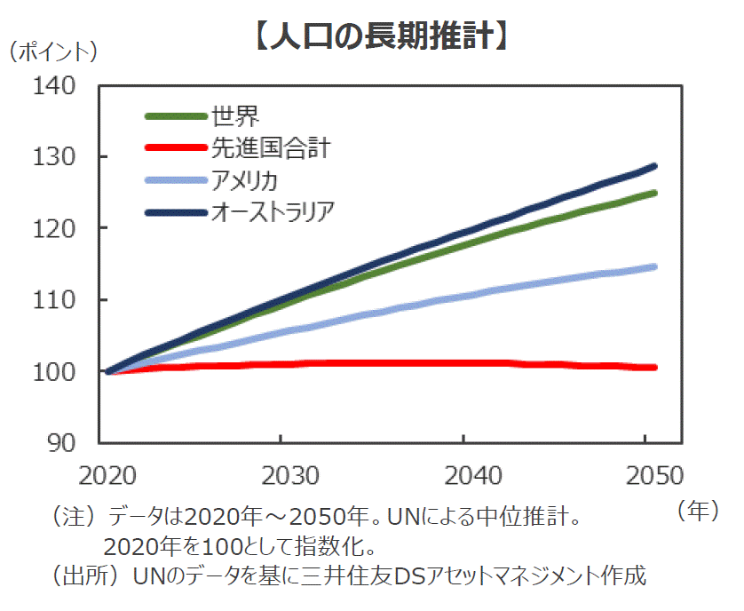 ■このため、先進国としてはめずらしく、今後も長期的に人口の増加が続くものと予想されています。国際連合(UN)の推計では、現在約2,600万人の人口は、2050年には約1.3倍の3,300万人まで増加するものと予想されています。