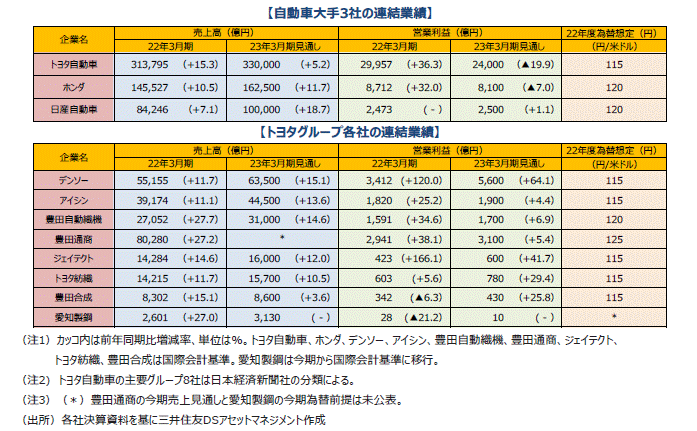 ■トヨタグループ主要8社の2021年度の連結決算は、挽回生産が予想ほど進まなかったことや原料高の影響もあり、まだら模様の結果となりました。また、2022年度の業績予想は、電動化や先進安全分野の貢献で大幅増益を見込むデンソーを除き、トヨタと同様に概ね保守的な見通しとなりました。