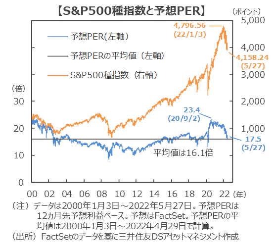 ■また、S&P500種指数の予想PERは5月27日現在17.5倍です。最安値を更新した5月19日は16.4倍でしたので、その水準からは上昇していますが、4月が上旬まで概ね19倍台だったことを考えると過熱感はないと思われます。