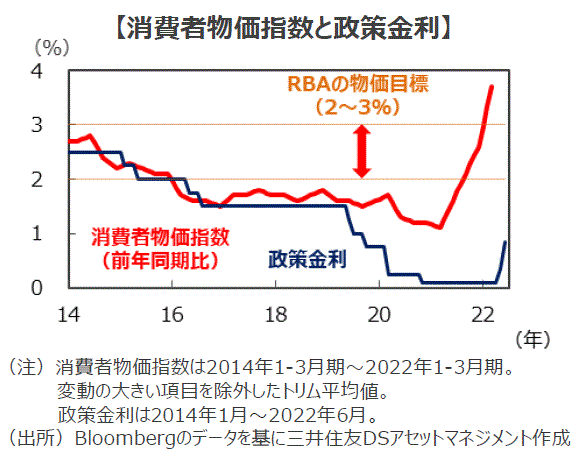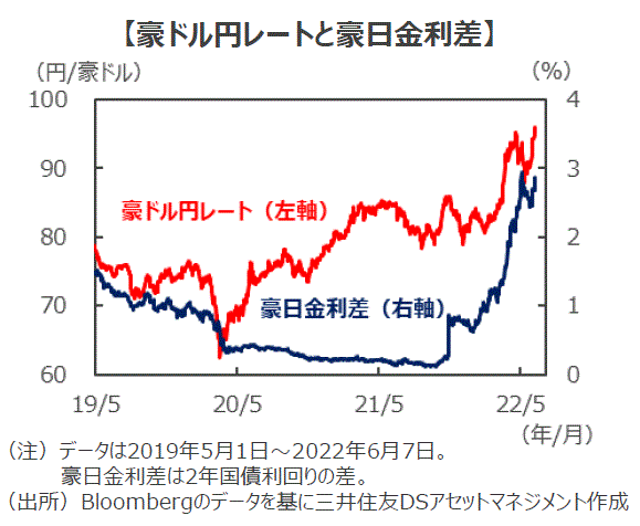 ■5月に続き、市場予想を大幅に上回る利上げとなったことから、金融政策決定会合後の為替市場で豪ドルは対円・対米ドルともに強含み、対円で一時96円台をつけました。RBAは、ウクライナ情勢や中国経済の不確実性による世界経済やコモディティ価格への不透明感を警戒しつつも、今後も金融政策正常化に向けてさらなる措置を取るとしており、今後も複数回の利上げが見込まれます。