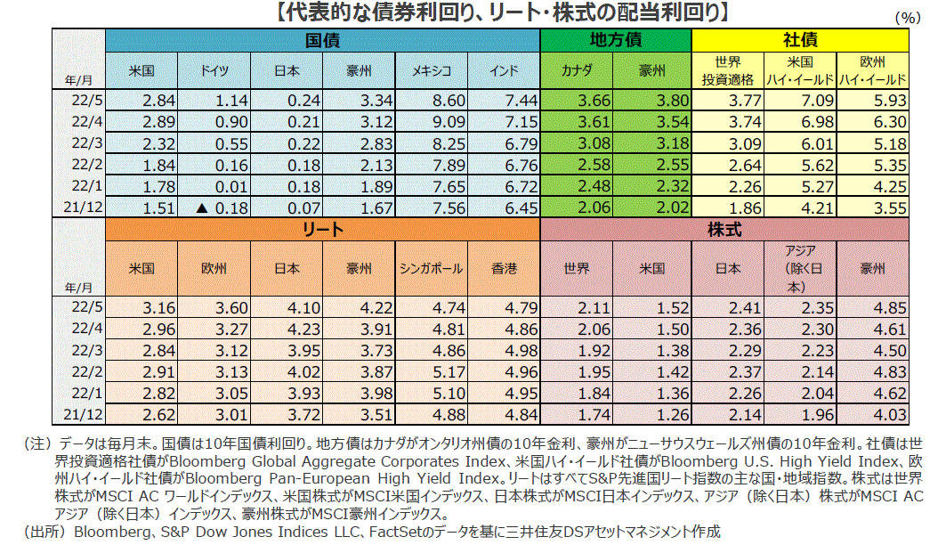 ■株式市場では、配当利回りは世界的に小幅ながら上昇しました。月前半は米国での金融引き締め加速による景気後退懸念などから株価は軟調でした。その後は中国・上海での都市封鎖(ロックダウン)が解除される見通しとなったことなどでリスク回避姿勢が後退し、月間では株価はほぼ横ばいでした。こうした中、米国や日本では配当の支払いが増加し、株式の配当利回りは小幅ながら上昇しました。