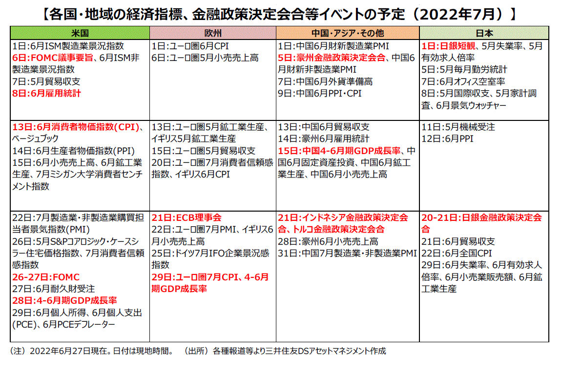 ■米国では7月26、27日に連邦公開市場委員会(FOMC)が開催されます。米国では依然として歴史的な水準でのインフレ高進が続いており、連邦準備制度理事会(FRB)は、6月の会合で約27年ぶりの0.75%の利上げを決定しました。7月6日には、この時の議事要旨が発表されます。3月に利上げを開始して以降、インフレや雇用情勢に影響は出てきているのか、関連指標の発表にも注目です。