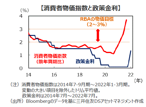 ■声明文では、インフレの高まりについて、多くが世界的な要因によるものとしつつも、豪州国内における強い需要や、ひっ迫した労働市場、一部のセクターにおける生産能力の制約なども影響していると指摘しています。RBAは今後について、インフレは年内にピークを迎え、RBAの目標とする2~3%に向かって低下すると見ています。