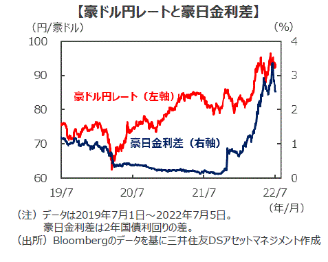 ■6月に続き、7月も0.5%の大幅な利上げとなったものの、概ね市場予想の通りだったことから、会合後の為替市場では豪ドル安・円高となりました。RBAは、金融政策正常化に向けて、今後数カ月の間にさらなる措置を取ると述べています。また、RBAは労働市場は一段とひっ迫するとの見方も示しており、今後政策金利は中立水準を超えてやや引き締め的な水準にまで引き上げられると見られます。弊社では、年末にかけて3.10%付近まで利上げが行われると見込んでいます。