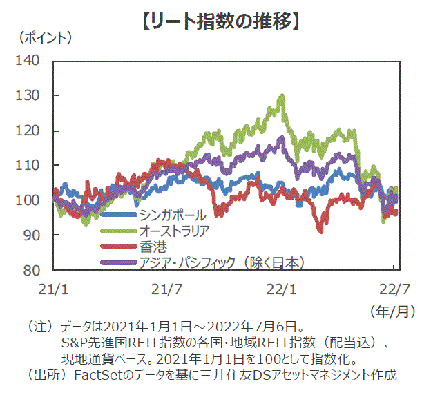 ■2022年前半のアジア・オセアニアのリート市場は、世界の中央銀行が金融引き締めを加速したことに伴い金利が急上昇したことや、先行きの景気後退が意識され、不動産市況の悪化懸念が強まったことから調整しました。