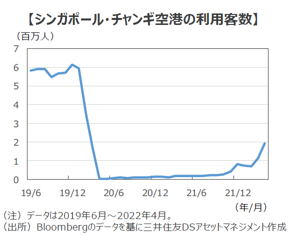 ■シンガポールではワクチン接種を条件にすべての国と地域から隔離なしでの渡航が認められたため、同国へのビジネス・観光目的の来訪者数が急回復しています。チャンギ空港の利用客数は今年4月に1.9百万人と、前年同月比10倍以上に増加しており、今後も一段の拡大が見込まれます。