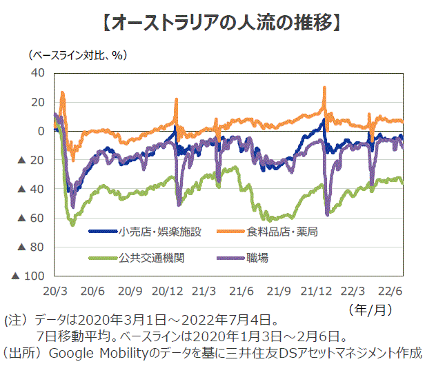 ■新型コロナ感染拡大後の人の移動をGoogle Mobilityによって確認すると、オーストラリアでは、年明けにオミクロン型によって感染が拡大したものの、比較的短期間で収まり、改善傾向を示しています。小売店・娯楽施設の人の移動もコロナ以前に戻りつつあります。