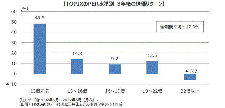 ■日本株には割安な印象が付きまとい、割安な株価評価となっていても、株価上昇にはつながらないとの思いを抱いている投資家の皆さんも多いと思います。そこで、PERの水準とその後の株価の推移を過去20年間の月次データを遡って確認しました。これによると、現在のPERの水準である13倍未満の時は、その3年後の株価の上昇率が極めて高いことが分かりました。