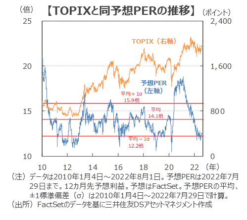 ■7月29日のTOPIXの12カ月先予想PERは12.4倍です。予想PERは2010年以降の平均が14.1倍、1標準偏差下回る水準が12.2倍ですので、TOPIXは割安圏に入っていると考えられます。
