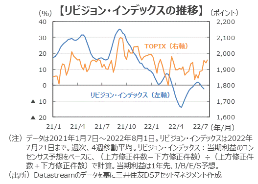 ■足元の好調な業績に支えられ、22年度の業績見通しは改善傾向となる一方、23年度の業績見通しが下方修正となっています。結果として、23年度の業績見通しも含む1年先予想利益ベースでみたリビジョン・インデックスは7月下旬以降、再び0を下回っています。TOPIXが割安圏から抜け出せない背景の1つとして、業績に対する不透明感の強まりがあると考えられます。