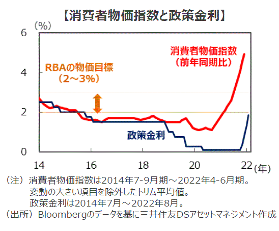 ■現在、世界的に高インフレが大きな問題となっている中、豪州の消費者物価指数(CPI)も、1990年初以来の高水準となっています。7月27日に発表された4ー6月期のCPIは、前年同期比+6.1%とRBAの目標を大きく上回っています。また、変動の大きい項目を除外した、基調的な物価を示すトリム平均値では同+4.9%でした。