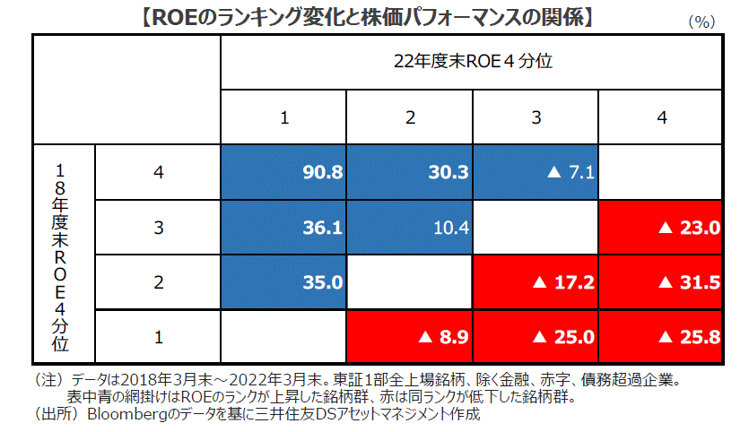 ■敬遠されがちな日本株でも、パフォーマンスが良好な一群があります。それは、株主資本利益率(ROE)を改善させている銘柄です。日本株のROEが最近のピークを付けた2018年3月末と直近決算期末である2022年3月末について、東証1部上場全銘柄(除く金融・赤字・債務超過企業)をROEで4分位にランク付けし(1が最上位、4が最下位)、ランクの移動と株価の関係を見たのが下の表です。