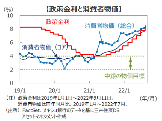 ■メキシコ銀行(中央銀行、中銀)は8月11日に金融政策決定会合を開き、政策金利を7.75%から8.5%に引き上げました。