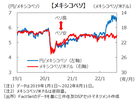 ■米国の景気後退が取りざたされる一方で、メキシコ経済は好調を持続しています。2022年4-6月の実質GDP成長率は前期比年率2.1%のプラスとなり、市場予想を上回りました。堅調な景気拡大と積極的な利上げ姿勢を受けて、ペソは今後も1米ドル=20ペソを中心とした堅調推移が続くものと予想しています。