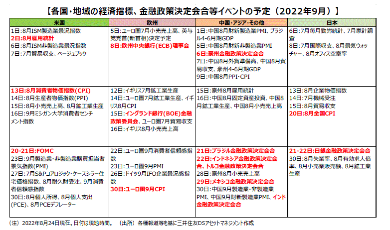 ■9月は米国だけではなく、多くの国・地域でも金融政策決定会合が予定されています。欧州や英国などでは利上げが見込まれていますが、エネルギー価格がとりわけ大きく上昇している事もあり、景気減速が近づいているとの見方があります。インフレと景気のバランスをどう取るのか、両中央銀行は難しい判断を迫られそうです。日本でも、引き続き日銀の目標を上回る消費者物価指数の上昇となる見込みですが、金融政策への方針は当面変わらない見込みです。