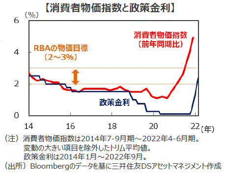 ■9月6日、豪州準備銀行(RBA)は金融政策決定会合で、政策金利を0.5%引き上げて2.35%としました。利上げおよび利上げ幅は市場の予想通りでした。RBAはインフレ率を物価目標の範囲に収めるべく、今年5月以降利上げを継続していますが、未だ豪州のインフレ率は1990年台初頭以来の高水準にあり、今後数カ月でさらに上昇して、年内にピークを迎えると見られています。