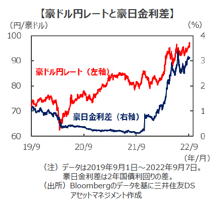 ■6日の会合後、為替相場は豪ドル高・円安となり、8日朝時点で1豪ドル=97円台前半となっています。ただしこれは、6日以降急速に米ドル高が進行していることに連れたもので、豪ドルの対米ドル相場で見ると豪ドル安となっています。根強い資源需要や良好な雇用環境、コロナ下で積みあがった貯蓄などを背景に豪州経済は堅調さを維持すると見られます。RBAは、インフレ抑制のために今後も利上げを継続することを示唆しているため、豪ドルの対円相場は堅調に推移すると見込まれます。