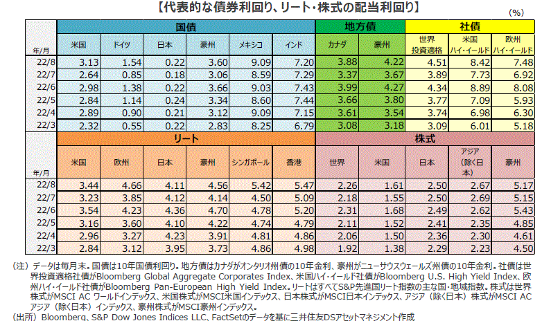 ■株式市場では概ね利回りが上昇しました。米国では消費者物価指数におけるインフレ圧力の低下等を背景にして、月央にかけて株価が上昇しました。しかしその後は、ジャクソンホール会議でパウエルFRB議長が利上げ継続の姿勢を明示したことから、株価は急反落しました。このため月間では株価が下落して、株式の配当利回りは上昇しました。