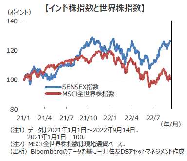 ■インド株の堅調さが際立っています。今年に入り、グローバルにインフレが加速し、米連邦準備制度理事会(FRB)をはじめとする世界の中央銀行が利上げを相次いで行ったため、世界の株式市場は大きく調整しました。MSCI全世界株指数は、6月に一時20%を超える下落幅となりました。その後反発しましたが、8月のジャクソンホール会議でのパウエルFRB議長発言により米金融引き締めが長期化する見通しが強まり急反落するなど、値動きの荒い展開となっています。こうしたなか、インド株は過去最高値に迫る堅調な展開となっています。