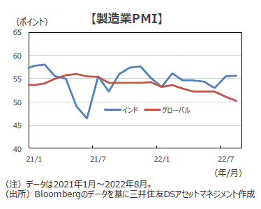 ■インドの8月の製造業購買担当者景気指数(PMI)は55.6と底堅く推移しているのに対し、グローバルPMIは緩やかながら低下基調にあります。こうした景況感の差も株価のパフォーマンスにつながっているとみられます。
