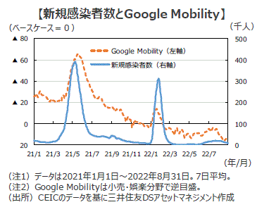 ■新型コロナウイルスの影響による、人々の移動の変化を計測する「Google Mobility(小売・娯楽)」をみると、感染者数の落ち着きとともに改善傾向が続き、コロナ禍以前の水準を回復しています。