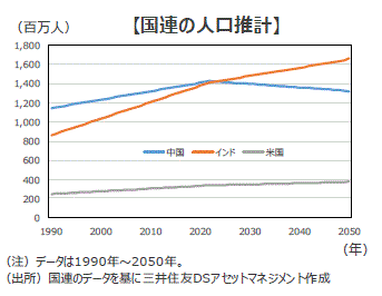■国連は7月、2023年にインドの人口が中国を上回り、世界最多になるとの人口推計を発表しました。中国とインドは2022年にそれぞれ14億人以上の人口を抱えていますが、インドは2050年に16億人を超える一方、中国は13億人に減少する予測となっています。インドは生産年齢人口の拡大する「人口ボーナス期」を迎えていることを示しています。