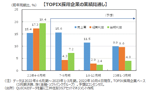 ■足元の生産活動、設備投資計画は堅調で、企業活動は好調です。その一方で、円安や輸入物価の高騰によるコスト負担の増加が業績に悪影響を与えており、企業業績は業種間のばらつきが拡大し、全体として増益率が抑えられやすい状況にあります。加えて、10-12月期はさらに増益率が低下することが見込まれており、一段の下方修正リスクにも留意する必要がありそうです。