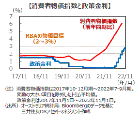 ■10月26日に発表された豪州の7-9月期の消費者物価指数(CPI)は、前年同期比+7.3%と依然RBAの目標を大きく上回り、過去最高水準となりました。また、変動の大きい項目を除外した、基調的な物価を示すトリム平均値では同+6.1%となりました。RBAの中心的な予測では、インフレ率は2022年内に8%前後となってピークを迎え、2023年には4.75%前後、2024年末には3%をやや上回る程度となり、徐々にRBAの物価目標に向かって低下していくと見られています。