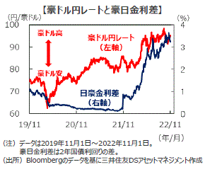 ■豪州の7-9月期のCPIが高水準だったこともあり、一部では0.5%の利上げを予想する向きもありましたが、今会合の0.25%の利上げは概ね市場予想の通りでした。RBAは声明文で、金融政策にはタイムラグがあり、これまでの金利上昇の完全な効果はまだ表れていないとの認識を示しつつも、今後もさらに利上げを実施することを示唆しました。今後は、世界経済の減速や、これまでの利上げの効果により豪州経済の成長ペースは緩やかになると見られますが、RBAの予測では2023年、24年は前年比+1.5%と底堅い成長を維持すると見られており、豪ドルは底堅い推移が見込まれます。