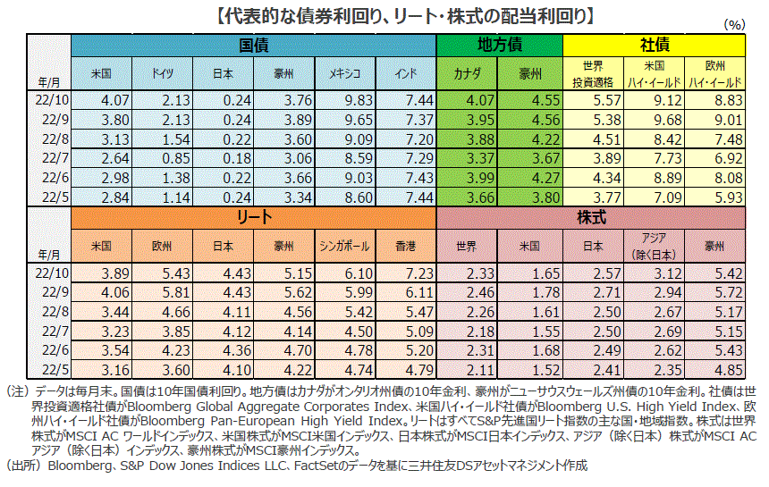 ■株式やリート市場では、FRBの利上げペース減速への期待などから米国や日本で株式やリートの価格が上昇し、配当利回りは低下しました。ただし、中国では習近平総書記が異例の党トップ3期目入りを果たし、今後の政策運営において経済の優先度が後退するとの懸念などから、株式やリートの価格が下落し、配当利回りは上昇しました。