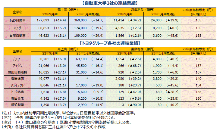 ■トヨタグループ主要8社の2022年度の上期決算は、円安効果を原材料高や労務費の上昇がかき消す形となり、総じて冴えない結果となりました。通期の為替前提についてはほとんどの会社が円安方向に見直していますが、金属事業が好調な豊田通商を除き通期の利益予想を据え置く企業が多く、落ち込んだ前年度との比較では大幅な増益見通しとなっているものの、引き続き厳しい事業環境をうかがわせる決算となりました。