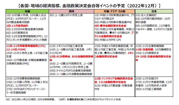 ■12月は、13日、14日に今年最後の米連邦公開市場委員会(FOMC)が開催される予定です。前回11月1日、2日に開催された時には、4会合連続で0.75%の利上げが実施されましたが、その後発表された10月の消費者物価指数(CPI)が市場予想を下回る結果となり、市場では利上げペースの減速への期待もあります。公表された11月会合の議事要旨では、大多数のFOMC参加者が、近いうちに利上げペースを減速することが適切になる可能性が高い、と述べています。12月の会合では、開催期間中に11月のCPIが発表される予定で、雇用統計と合わせて、これまでの大幅かつ急速な利上げの効果が物価や雇用にどのように表れてくるのか、またこれらによる利上げペースへの影響はあるのかなどが注目されます。