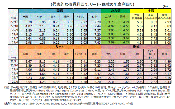 ■高止まるインフレに対して、米連邦準備制度理事会(FRB)をはじめとする多くの中央銀行は、これまで連続して大幅な利上げを実施してきました。そうした中、発表された米国の10月の消費者物価指数が市場予想を下回ったことで、FRBの利上げペースの減速期待が高まり、債券、株式、リートなどの利回りは概ね低下しました。