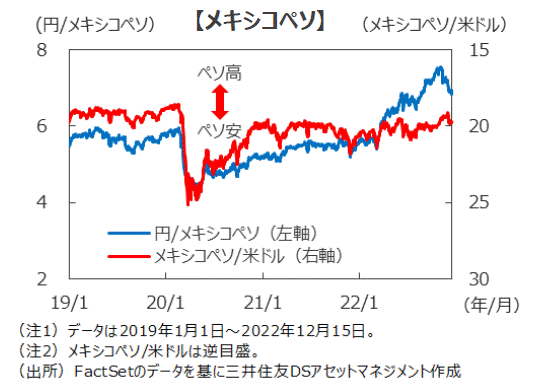 ■大きく進んだ米ドル高の反動から対主要通貨でドルが反落したため、メキシコペソも一時的に対ドルで強含む局面がありましたが、足元ではこうした動きは落ち着きつつあります。