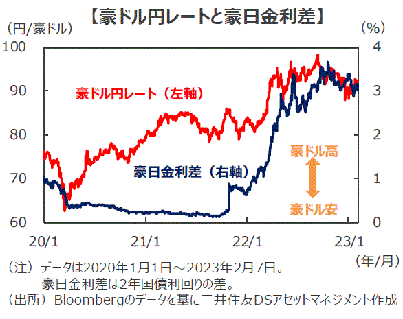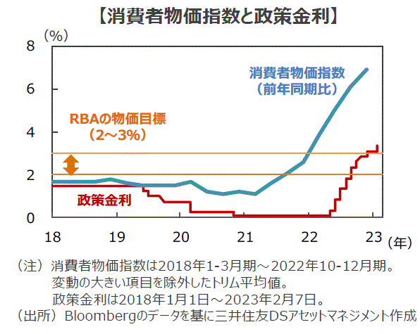 ■1月下旬に発表された2022年10-12月期の消費者物価(基調的な物価の動きを示すトリム値)が前年同期比+6.9%と高い伸びだったため、市場ではRBAが緩やかな利上げペースを維持するとの見方が多く、今回の0.25%の利上げは市場予想通りでした。