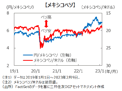 ■米国での早期の利上げ終了を見越して、米ドルは対主要通貨で軟調な展開となっています。このためメキシコペソも、対ドルで堅調な推移が続いてきました。加えて、今回のように、インフレの高止まりを受けた米国を上回るペースでの金融引き締めが続いた場合、金利上昇を好感したペソへの資金流入が続く可能性があります。弊社ではこれまで、1米ドル=20ペソを中心とした推移を予想していましたが、今後は新型コロナ流行前の19ペソを中心としたレンジに戻るとともに、ペソ強含みの展開となるものと予想しています。