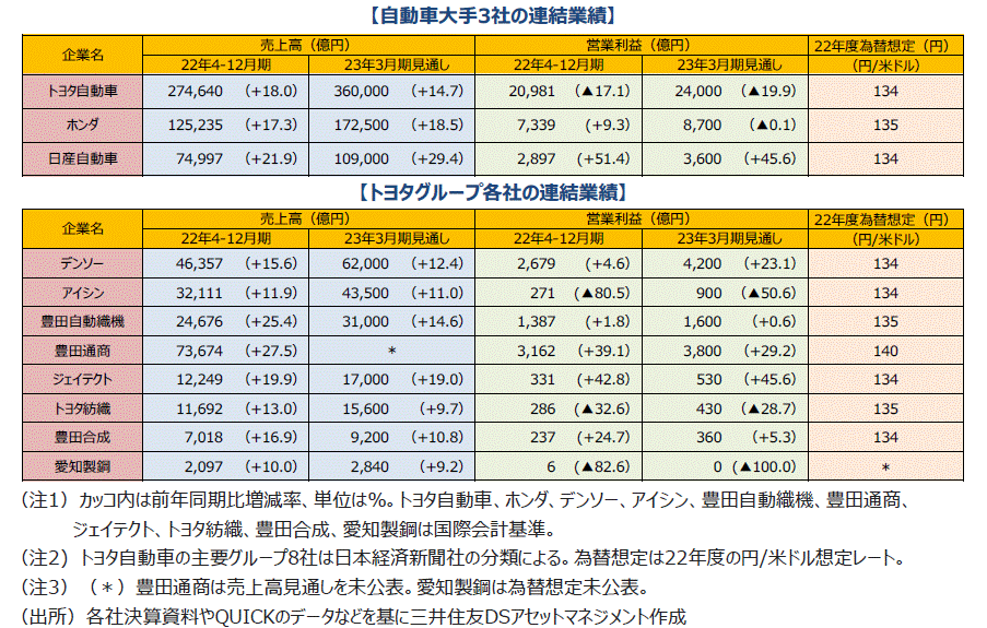 ■自動車大手3社の2022年度4-12月期決算は、大幅な円安により揃って前年同期比で大幅な増収となったものの、営業利益は販売台数の伸び悩みや原材料高の影響を強く受ける結果となりました。トヨタは仕入れ先の負担の肩代わり分を含む原材料高が円安や台数増の効果を上回り、減益となりました。一方、ホンダは値引きの見直しやバイク販売の好調から増益を確保しました。また、日産は販売低迷が続いたものの、値引きの見直しや前年に業績が落ち込んだ反動から、引き続き低水準ではあるものの増益となりました。尚、年明け以降、急速に円高が進んだこともあり、各社とも今期の利益見通しを据え置きました。