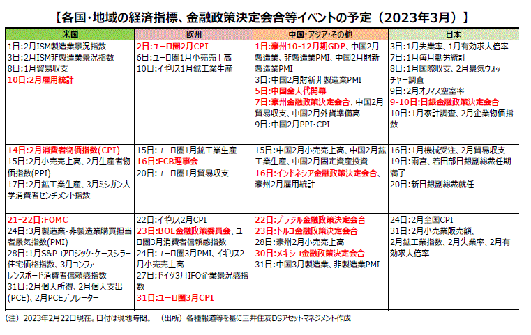 ■米国では、3月21日、22日に米連邦公開市場委員会(FOMC)が開催されます。前回会合後の記者会見で、パウエル米連邦準備制度理事会(FRB)議長は、インフレはピークを打ったとの認識を示しながらも、あと複数回程度の利上げを示唆しました。その後、発表された雇用統計が市場予想を大きく上回って米国経済の強さが示されたことで、市場では5月ないしは6月まで利上げが継続されると見る向きも増えています。3月のFOMCでは、FOMCメンバーが適切と考える「政策金利水準の分布図(ドットチャート)」も更新される予定で、会合後のパウエルFRB議長の発言や、雇用・物価統計等と合わせて目が離せません。
