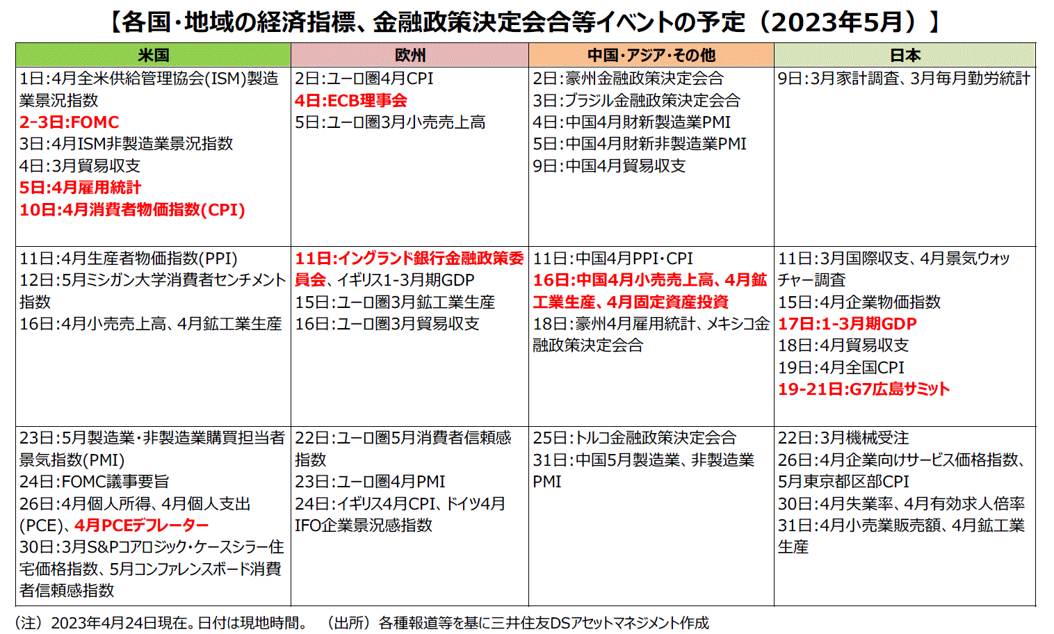 ■5月は月初に米欧の中央銀行の金融政策決定会合が行われます。まず、2日~3日に米連邦公開市場委員会(FOMC)が開催されます。3月に高まった金融不安が和らぐ中、米連邦準備制度理事会(FRB)がFOMCでどのような決定を下すのか、全世界が注目しています。3月のFOMCで公表された政策金利見通し(ドットチャート)によれば、利上げはあと1回(0.25%)で終了する見込みとなっています。今回0.25%の利上げが実施されれば、FRBの利上げが打ち止めとなる可能性があります。