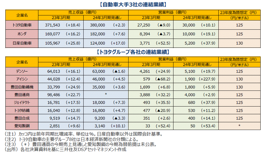 ■自動車大手の2022年度決算は円安の追い風はあったものの、半導体不足による生産調整や原材料高が足を引っ張り、まちまちの結果となりました。一方、主要3社の今期業績見通しは、円安が一巡する一方、半導体不足の解消による生産拡大が寄与することで2桁増益となる見通しです。トヨタ自動車の営業利益見通しは10%増の3兆円、ホンダは同19%増の1兆円と、保守的な為替前提にもかかわらず史上最高益の更新を見込んでいます。