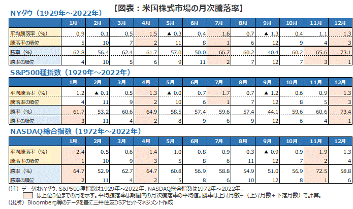 ■指数間で若干の差異はありますが、①1月以外にも4月、7月、11月、12月に上昇しやすい、②3指数ともに9月が下落しやすい、といった傾向が読み取れました。足元の9月を起点に考えると、11月、12月に上昇しやすいという傾向がある点は注目されそうです。なお、1月効果ですが、NASDAQ総合指数の1月の上昇率が最も高いことを確認できました。S&P500種指数も1月は勝率で上位となりましたが、上昇率ではNASDAQ総合指数ほどの強い傾向は認められませんでした。