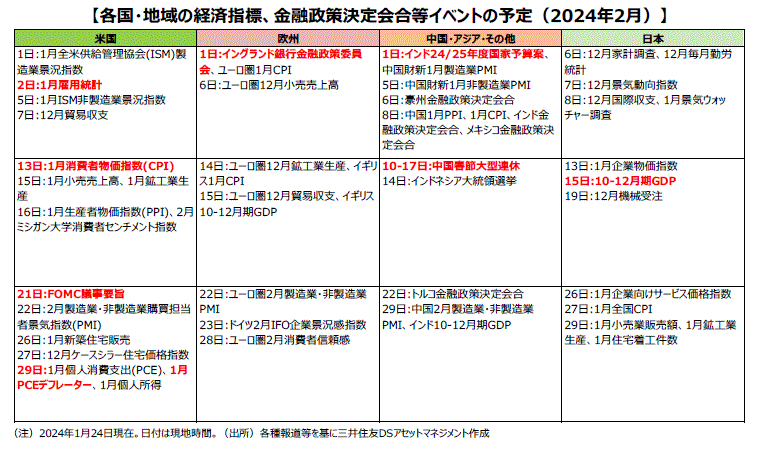 ■中国では、23年の実質GDP成長率が前年比+5.2%と政府目標の「5%前後」は達成したものの、名目GDP成長率は同+4.6%にとどまり、名目が実質を下回りました。GDPの名実逆転は、中国のデフレ圧力の強さを示しています。このため1月の消費者物価指数(CPI)や生産者物価指数(PPI)が注目されます。また、春節(旧暦の正月、24年は2月10日)の大型連休での消費動向が注目されます。