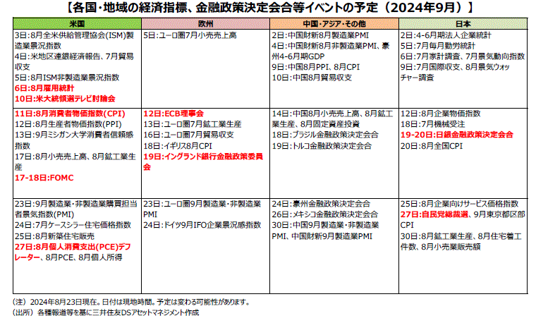 ■米連邦準備制度理事会(FRB)のパウエル議長は8月23日、経済シンポジウム「ジャクソンホール会議」の講演で、「政策を調整すべき時が来た」と、次回9月の米連邦公開市場委員会(FOMC)での利下げをほぼ明言しました。9月17~18日のFOMCで4年半ぶりとなる利下げが確実視されるなか、利下げ幅に加え、FOMC参加者が適切と考える政策金利の見通し(ドットチャート)が注目されます。