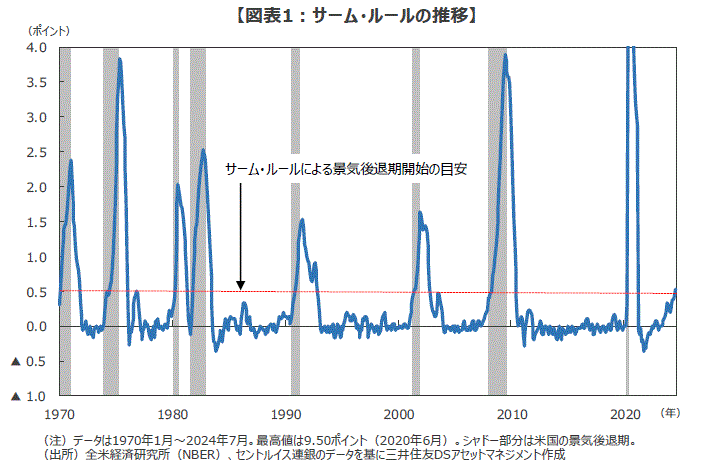 ■8月初めに発表された7月の失業率は4.3%となり、「サーム・ルール」による値は0.53ポイントとなりました(図表1)。FRBの利下げ開始に向け、景気後退期開始のサインを警戒していた金融市場にとっては、まさにシグナル点灯の瞬間だったと言えます。