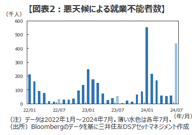■しかし、統計の内訳を見てみると、悪天候による就業不能者の数が、平年の同月と比べて大幅に増加し(図表2)、一時的な解雇者数も増加しています。