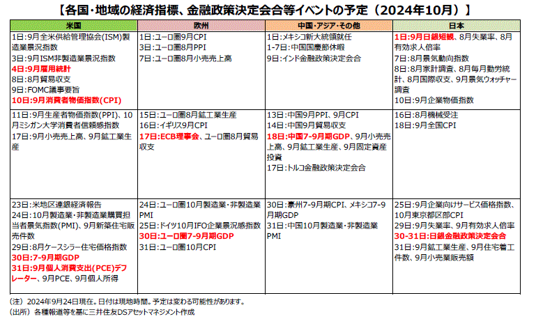 ■10月末には、日銀の金融政策決定会合が開催されます。植田和男総裁は9月会合後の記者会見で、政策判断に「時間的な余裕がある」と述べたことから、10月の追加利上げの可能性は低いとみられます。同時に公表される「経済・物価情勢の展望(展望リポート)」が、日銀の利上げ路線をみる上で注目されます。